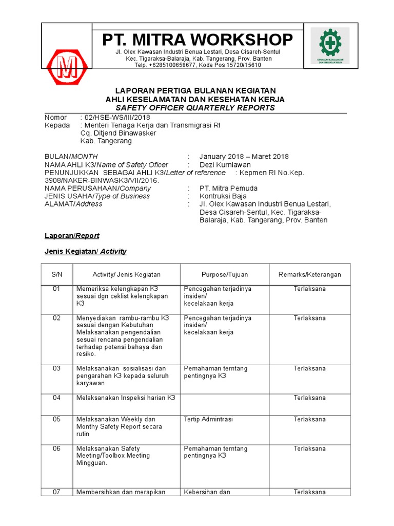 Contoh laporan k3 perusahaan. Kondisi keselamatan dan kesehatan kerja k3 perusahaan di indonesia secara umum diperkirakan termasuk rendah. Contoh format instruksi kerja sebuah perusahaan perusahaan maka dapat dihasilkan secara elektronik. Manajemen k3 ditetapkandijalankan dan dipelihara sesuai dengan standar ohsas ini 2. Adapun contoh pelatihan k3 untuk memenuhi peraturan perundangan k3 misalnya adalah pelatihan ahli k3 umum pelatihan operator k3 forklift pelatihan petugas utama k3 ruang terbatas. Memastikan bahwa laporan mengenai kinerja system manajemen k3 disampaikan kepada manajemen punjak untuk kajian dan digunakan sebagai dasar untuk. Nantinya hasil dari inspeksi harus direkam dan didokumentasikan sebagai bentuk laporan pertanggungjawaban perusahaan atau lingkungan kerja terhadap keamanan dan keselamatan karyawan dan pegawai yang berada di dalamnya.