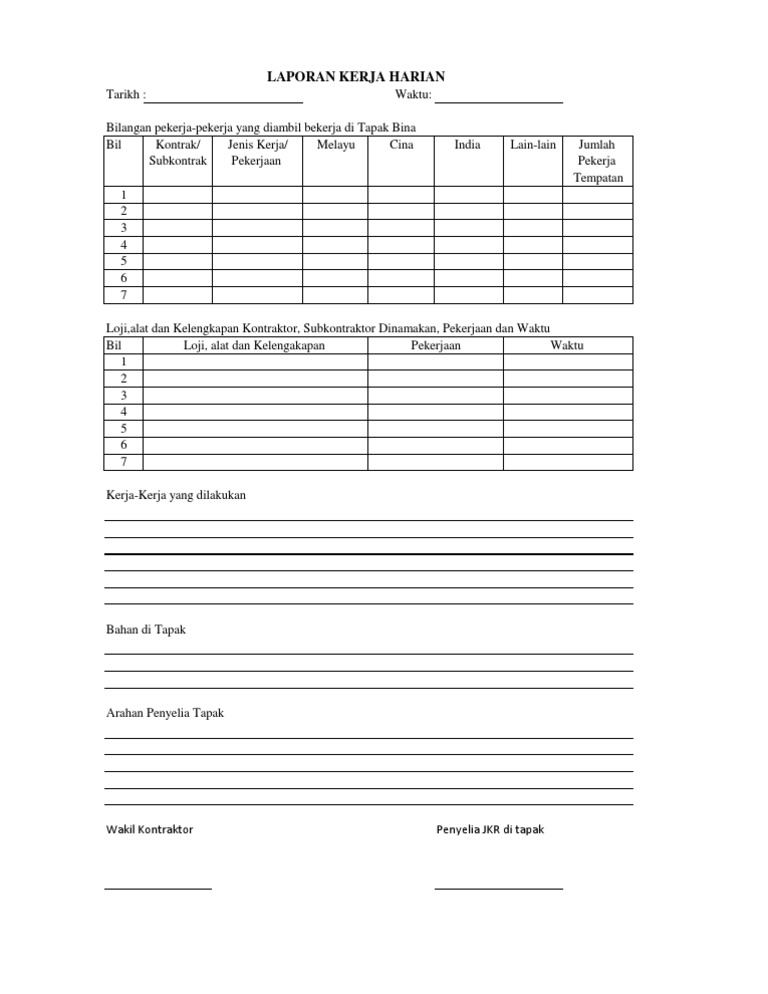 Contoh laporan kerja harian. Laporan harian ini memuat tentang tenaga kerja material item pekerjaan progress dan volume pekerjaan serta data cuaca di lapangan. Laporan kerja menjadi kegiatan rutin kalian yauntuk laporan kerja ini akan menjadi tanggung jawab kita selama kita bekerja di dalam perusahaan. Bagi anda yang memiliki pekerja dengan sistem harian maka surat perjanjian kerja harian sangat diperlukan. Contoh surat perjanjian kerja harian lepas surat perjanjian kerja harian lepas nomer. Jika kalian kerja menjadi pegawai atau karyawan pns maupun proyek kontraktor. Laporan ini di buat oleh konsultan untuk memantau perkembangan progress kegiatan lapangan kegiatan proyek agar selesai tepat waktu.