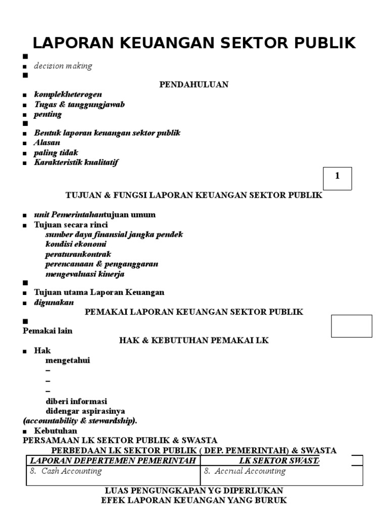 Laporan keuangan sektor publik tidak dapat disamakan dengan laporan keuangan di sektor swasta baik format maupun elemennya karena organisasi sektor publik memilki batasan batasan berupa pertimbangan non moneter seperti pertimbangan sosial dan politik. Pemakai laporan keuangan sektor publik dan kepentingannya drebin et al. Implementasi laporan keuangan sektor publik dan unsur unsurnya di organisasi sektor publik pemerintah pusat laporan keuangan pemerintah pusat disajikan sebagai wujud pertanggung jawaban setiap entitas pelaporan yang meliputi laporan keuangan pemerintah pusat laporan keuangan kementerian negaralembaga dan laporan keuangan pemerintah daerah.