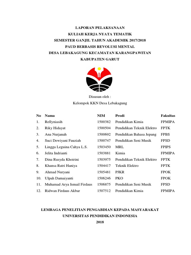 Kegiatan ini lebih mengutamakan aktivitas nyata yang dilakukan oleh para mahasiswa. Segenap pihak yang telah membantu pelaksanaan kuliah kerja nyata hingga pembuatan laporan yang tidak dapat kami sebutkan satu per satu. Laporan kkn ini berisi bab i bab ii dan bab iii. Dengan selesainya laporan kkn ini diharapkan dapat digunakan sebagai bahan pertimbangan dalam pemberian nilai mata kuliah kkn. Sebagai panduan sebelum pengesahan adalah kover yang berisi judul keterangan laporan kkn logo perguruan tinggi agama islam nama kelompok atau individu tergantung jenis laporang kelompok atau individu dan terakhir dicantumkan nama perguruan tinggi. Inilah contoh laporan akhir kkn kelompok pdf.