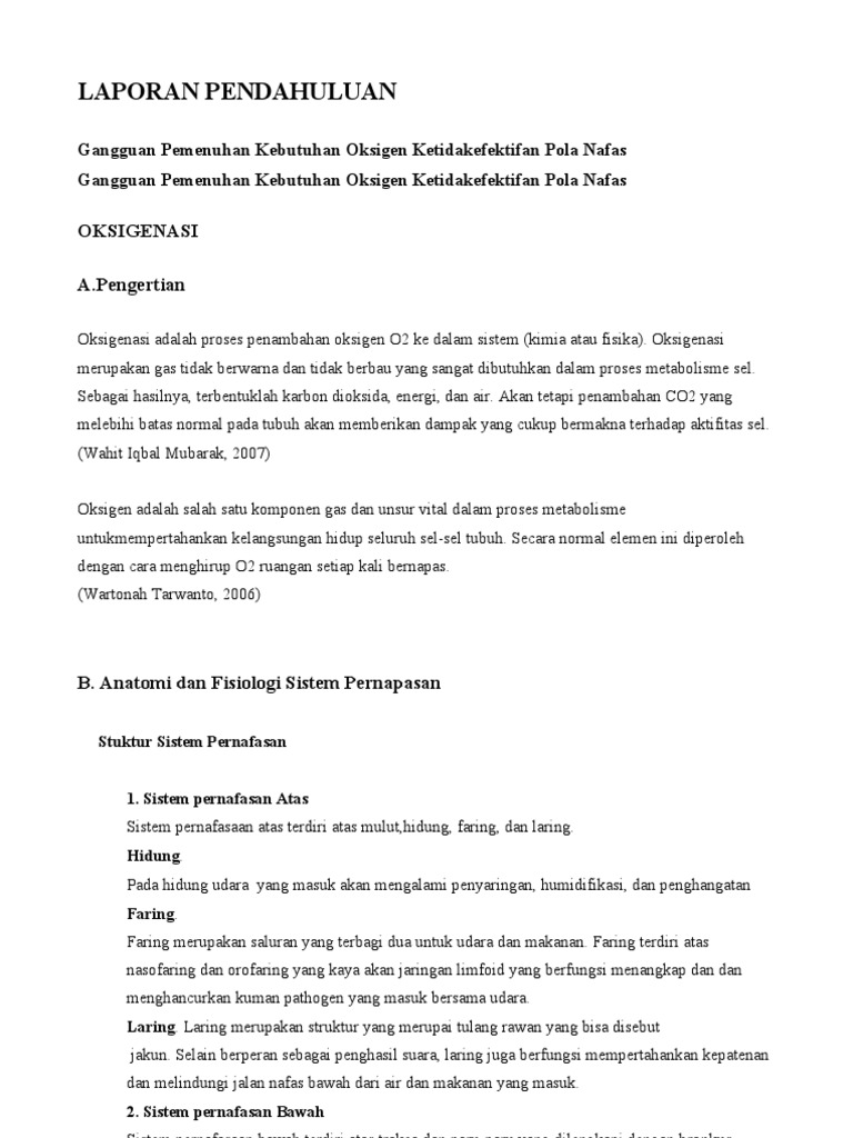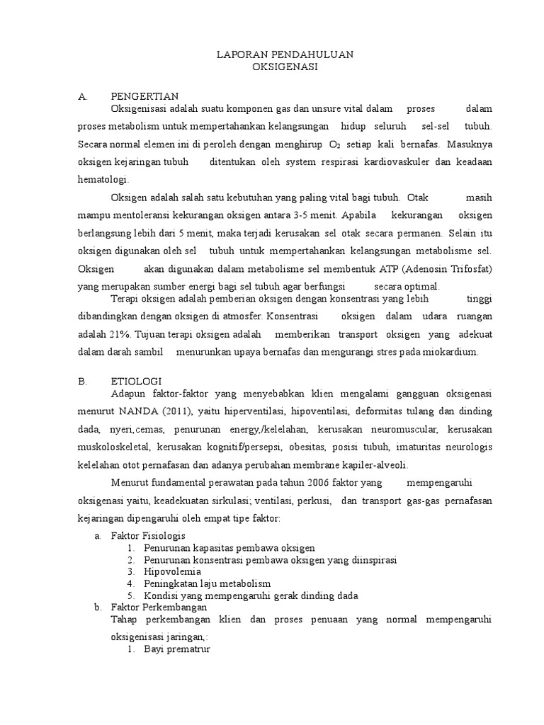 Contoh laporan pendahuluan oksigenasi. Oksigenasi adalah proses penambahan oksigen o2 ke dalam sistem kimia atau fisika. Definisi congestive heart failure chf adalah suatu kondisi dimana jantung mengalamiudjianti 2010. Bandingkan paru kanan dan kiri. Apabila lebih dari 4 menit orang tidak mendapatkan oksigen maka akan berakibat pada kerusakan otak yang tidak dapat diperbaiki dan biasanya. Laporan pendahuluan oksigenasi a. Laporan pendahuluan kebutuhan oksigenasi a.