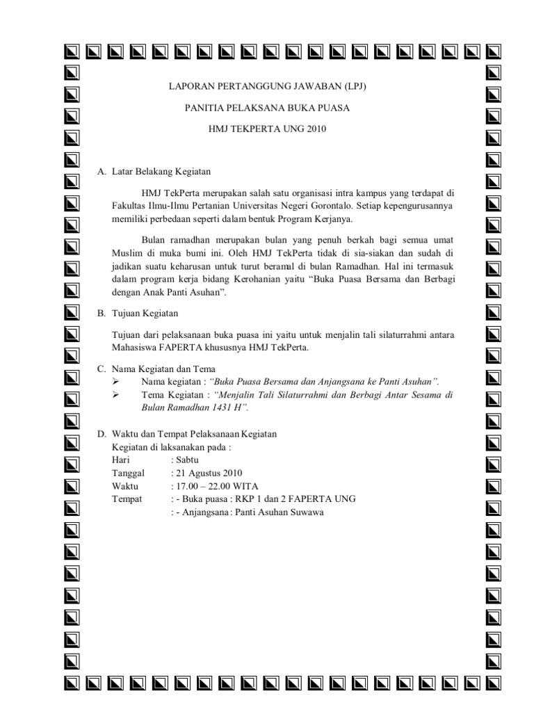 Laporan pertanggungjawaban lpj oleh dosenpendidikan diposting pada 05022020. Demikian laporan pertanggung jawaban ini kami buat dengan sebaik baiknya dengan harapan laporan kegiatan ini dapat menjadi acuan demi perkembangan kegiatan kegiatan serupa pada periode berikutnya. Kami mohon maaf atas segala kekurangan dan kesalahan yang telah kami lakukan. Contoh lpj kegiatan contoh lpj kegiatan desa seminar pramuka pelatihan mahasiswa osis dll hallo sahabat pembaca yang budiman pada kesempatan kali ini penulis akan berbagi ilmu tentang pembuatan contoh lpj suatu kegiatanlpj dalam suatu kegiatan ini sangat penting untuk kita pelajari karena menyangkut laporan laporan pertanggung jawaban hasil kerja dalam suatu kegiatan. Cukup sekian pembahasan tentang contoh laporan pertanggungjawaban lpj kegiatan terbaik jika ada hal yang ditanya ataupun kritik dan saran silahkan isi di kolom komentar. Kini tak perlu khawatir.