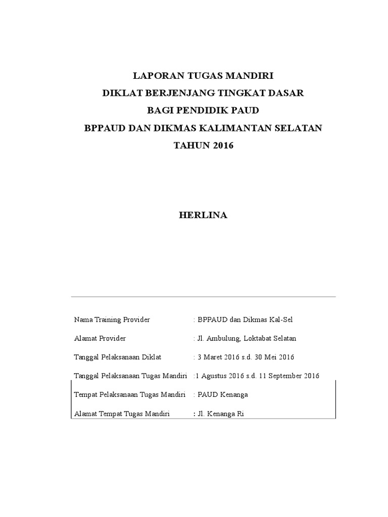 Contoh laporan tugas mandiri diklat dasar paud 2016. Begitulah yang dapat admin bagikan terkait contoh laporan tugas mandiri diklat dasar paud 2018 pdf. 21 oktober 15 november. Laporan akhir tugas mandiri diklat berjenjang paud tk tingkat dasar 2014 1. Setelah mengikuti rangkaian pendidikan sesuai jadwal yang telah ditetapkan maka dalam rangka memenuhi kwajiban peserta diklat berjenjang tingkat dasar pendidik paud adalah menyusun dan menyerahkan laporan akhir pelaksanaan tugas mandiri. Laporan tugas mandiri diklat berjenjang tingkat dasar bagi pendidik paud kabupaten purbalingga tahun 2014 erlina nama traning provider. Jldiponegoro ungaran tanggal pelaksanaan diklat.