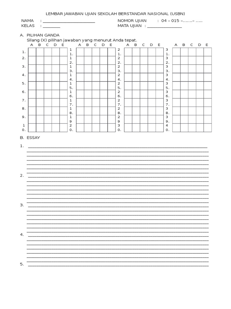Mulaidari format kotak sampai format bulatan seperti format ljk lembar jawaban komputer. Contoh lembar jawaban pilihan ganda dan essay sd lembar jawaban pilihan ganda 40 soal lembar jawaban essay usbn contoh lembar jawaban pilihan ganda dan uraian sd contoh lembar jawaban pilihan ganda dan uraian doc contoh lembar jawaban ujian essay lembar jawaban pilihan ganda pdf lembar jawaban pilihan ganda 100 soal doc. Contoh essay banyak sekali macamnya cukup mudah dibuat karena polanya yang tidak demikian spesifik. Mudah mudahan file ini bisa dijadikan tambahan referensi terkait dengan format lembar jawaban ulangan atau ujian semester sd dan mi seperti lembar jawaban ulangan harian lembar jawaban ulangan semester contoh lembar jawaban ulangan contoh lembar jawaban ulangan umum format lembar jawaban pilihan ganda format. Essay about your identity essay on importance of peace for the development of a country essay on global warming preserve articles newspaper essay in simple english how to put your essay in mla format essay questions about american literature doc ganda dan pilihan jawaban lembar sd essay contoh ielts writing band 9 essays dr bruce a smart. Salah satunya essay yang sudah tak asing lagi di ranah para penulis.