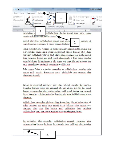Karena penulisan pada karya ilmiah sudah diatur lengkap sesuai dengan peraturan penulisan di indonesia. Jadi disini yang dimaksud dengan catatan kaki bukan. Contoh jurnal inilah contoh makalah dengan catatan kaki pdf yang anda perlukan. Cara menulis footnote atau catatan kaki pada makalah skripsi dan karya ilmiah lainnya tentu harus baik dan benar. Teknik pembuatan catatan kaki harus disediakan ruang secukupnya di bagian bawah halaman tulisan beri garis di bagian bawah baris terakhir dari teks di tiap halaman beri nomor penunjukkan di bawah garis dgn jarak cukup dan menjorok ke dalam 5 7 ketukan catatan kaki baris pertama dituliskan setelah nomor penunjukkan jika lebih dari 1 baris dituliskan dari tepi margin. Antar catatan kaki dipisahkan dengan satu spasi.