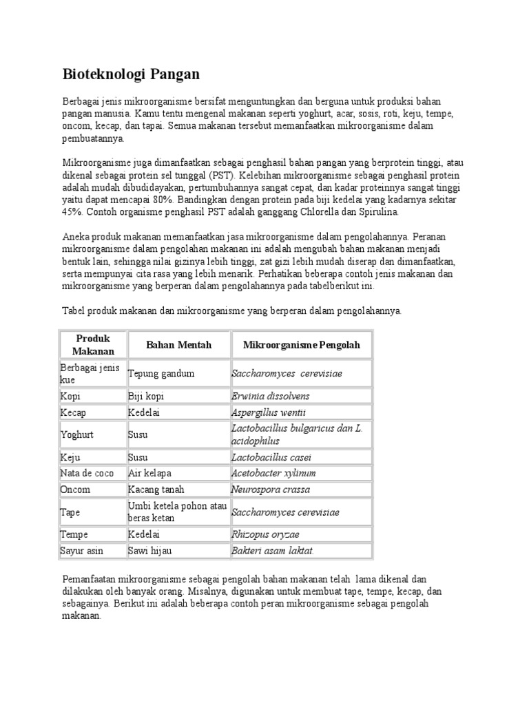 Contoh produk yang dihasilkan melalui pengasaman acarkhimchi. Tempe tempe merupakan salah satu contoh produk bioteknologi konvensional yang sudah dikenal luas di masyarakat kita. Mikroba yang dapat merusak makanan tidak dapat hidup pada makanan. Fermentasi adalah suatu teknik pengolahan makanan yang mana bahan pokok akan menjadi makanan siap saji dengan menggunakan mikroorganisme tertentu. Jenis pengertian mikroorganisme menurut para ahli beserta contohnya mikroorganisme atau mikroba adalah organisme yang sangat kecil sehingga untuk mengamati bantuan sarana yang diperlukanmikroorganisme juga disebut organisme mikroskopis. Khamir yang tidak diinginkana dalah yang ada pada makanan dan menyebabkan kerusakan pada uice buah sirup molase madu jelly daging dan sebagainya.