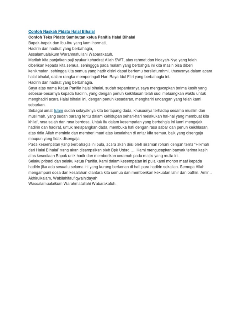 Contoh naskah pidato halal bihalal. Kami mengucapkan banyak terima kasih atas kesediaan bapak untk hadir dan memberikan ceramah pada majlis yang mulia ini.