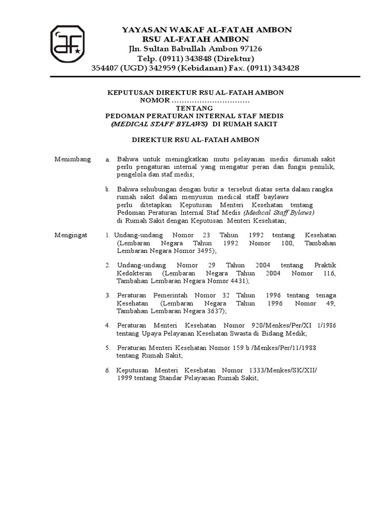 Medical staff bylaws rumah sakit pedoman. 2 staf medis dapat diberhentikan baik secara tetap atau sementara apabila. Maka medical staff bylaws rumah sakit juga dapat diartikan merupakan produk hukum tertinggi di staf medis. Training penyusunan medical staff bylaws. 44 tahun 2009 tentang rumah sakit peraturan internal rumah sakit hospital by laws merupakan peraturan organisasi rumah sakit corporate by laws dan peraturan staf medis rumah sakit medical staff by laws yang disusun dalam rangka menyelenggarakan tata kelola perusahaan yang baik good corporate governance dan tata. Peraturan internal rumah sakit umum full bethesda hospital bylaws adalah aturan dasar yang mengatur tata cara penyelenggaraan rsu full bethesda oleh dewan pengawas dan direktur rumah sakit yang ditetapkan oleh direksi.
