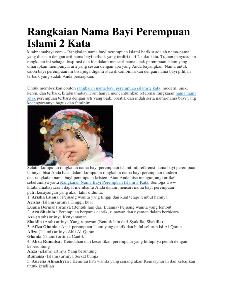 Karena pada dasarnya tiap kebahagiaan yang dirasakan sang anak perempuan pasti turut dirasakan oleh orangtuanya. Nama yang diberikan pada anak tentu harus memiliki makna yang baik sebab nama adalah sebuah doa dan harapan orang tua kepada anak dimasa yang akan datang. Dengan harapan kumpulan nama bayi perempuan islami disini dapat membantu para orang tua yang masih kesusahan merangkai nama dari islam untuk bayi perempuan. Elok nama bayi perempuan indonesia cantik 274. Didalam islam nama adalah sebuah titipan doa orangtua yg diubah menjadi serangkaian kata indah penuh makna. Kompilasi terbaik rangkaian nama bayi perempuan islami modern dan artinya yang bisa menjadi acuan untuk memilih nama perempuan yang indah dan sesuai keinginan untuk calon buah hati anda.
