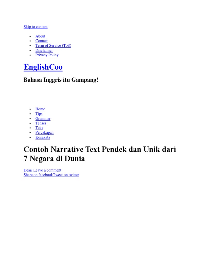 The one of those eggs was too big for the usual hens egg. Once upon a time there was a queen of arabia named maura. Nah semoga contoh contoh dibawah ini bermanfaat buat anda. Teks naratif menggunakan simple past tense. 10 contoh narative text pendek bahasa inggris dan artinya terbaru nah kalau sebelumnya pengertian lengkap dan contoh narrative text khususnya text narrative yang berbentuk legenda telah kita pelajari pada halaman ini giliran contoh narrative text example of narrative text dan terjemahannya yang lain yang akan kita bahas. Contoh narrative text legend alias legenda dalam bahasa inggris yakni terjadinya danau toba batu menangis tangkuban perahu candi prambanan dan selat bali.