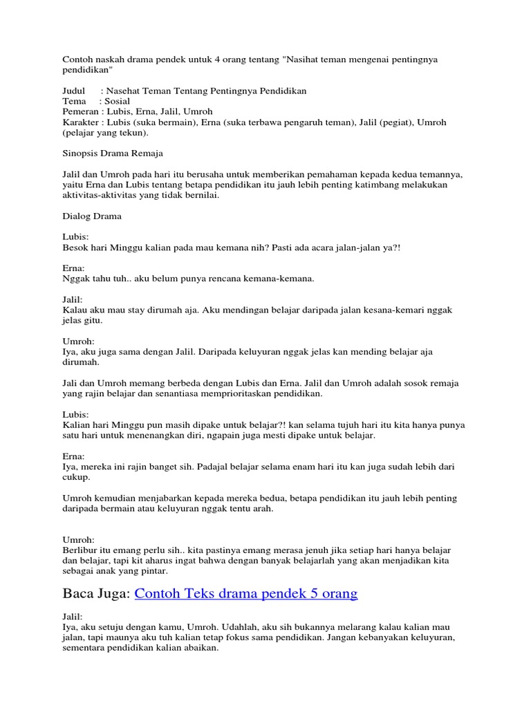 Contoh naskah drama 5 orang tentang pendidikan singkat. Tentang belajar tema. Contoh naskah drama bahasa inggris 5 orang. Tomy sedang ngobrol dengan lisa disebuah taman yang tidak jauh dari rumah mereka. Arti seorang teman jumlah aktor. Berikut ini adalah contoh teks drama singkat tentang orang. Prolog adalah bagian pembuka dari sebuah naskah drama yang menjelaskan sinopsis dan gambaran mengenai latar drama yang akan dimainkan.