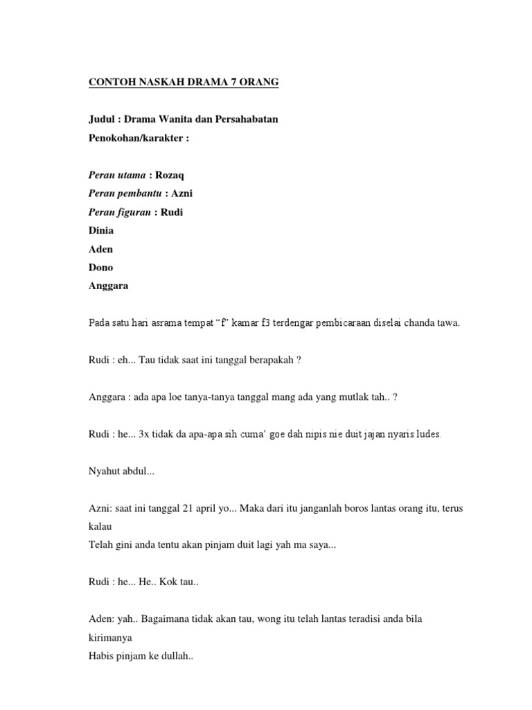 Langsung saja kita lihat naskah drama bahasa jawa 7 orang. Naskah teks drama drama di dalam drama suatu hari disebuah sekolah yang sangat nyaman aman dan damai terdapat sebuah kelompok belajar yang tediri dari 7 orang. Bahasa indonesia jumlah karakter. Naskah drama 7 orang komedi reaksi. Adi banu budi sita dini sinopsis drama suatu kumpulan contoh naskah drama teater 5 orang tentang persahabatan kejujuran mencontek sinopsis. Contoh naskah drama 5 orang belajar dan mencontek judul.