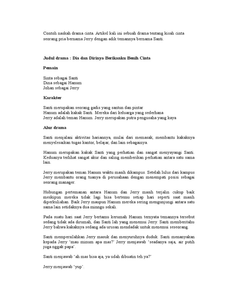 Contoh naskah drama romantis. Teater persahabatan lucu komedi 3 5 6 7 8 9 orang untuk pembahasan kali ini kami akan mengulas mengenai naskah drama yang dimana. Suatu ketika disaat keadilan sudah menjadi kata yang punah. Contoh naskah drama drama persahabatan teater panjang komedi singkat dll hallo sahabat pembaca yang budiman pada kesempatan yang berbahagia kali ini kita akan membahas makalah tentang beberapa macam contoh naskah dramabagi teman teman yang suka dengan sastra pasti sudah tidak asing lagi dengan masalah drama ini. Contoh naskah drama 4 orang singkat tentang persahabatan di sekolah. Contoh naskah drama musikal sembilan orang sumber. Contoh naskah drama percintaan berbicara soal cinta memang begitu menyenangkan banyak sekali objek yang terkait dengan cinta dan tentunya ngga akan pernah habis jika dibahas dengan kata kata.