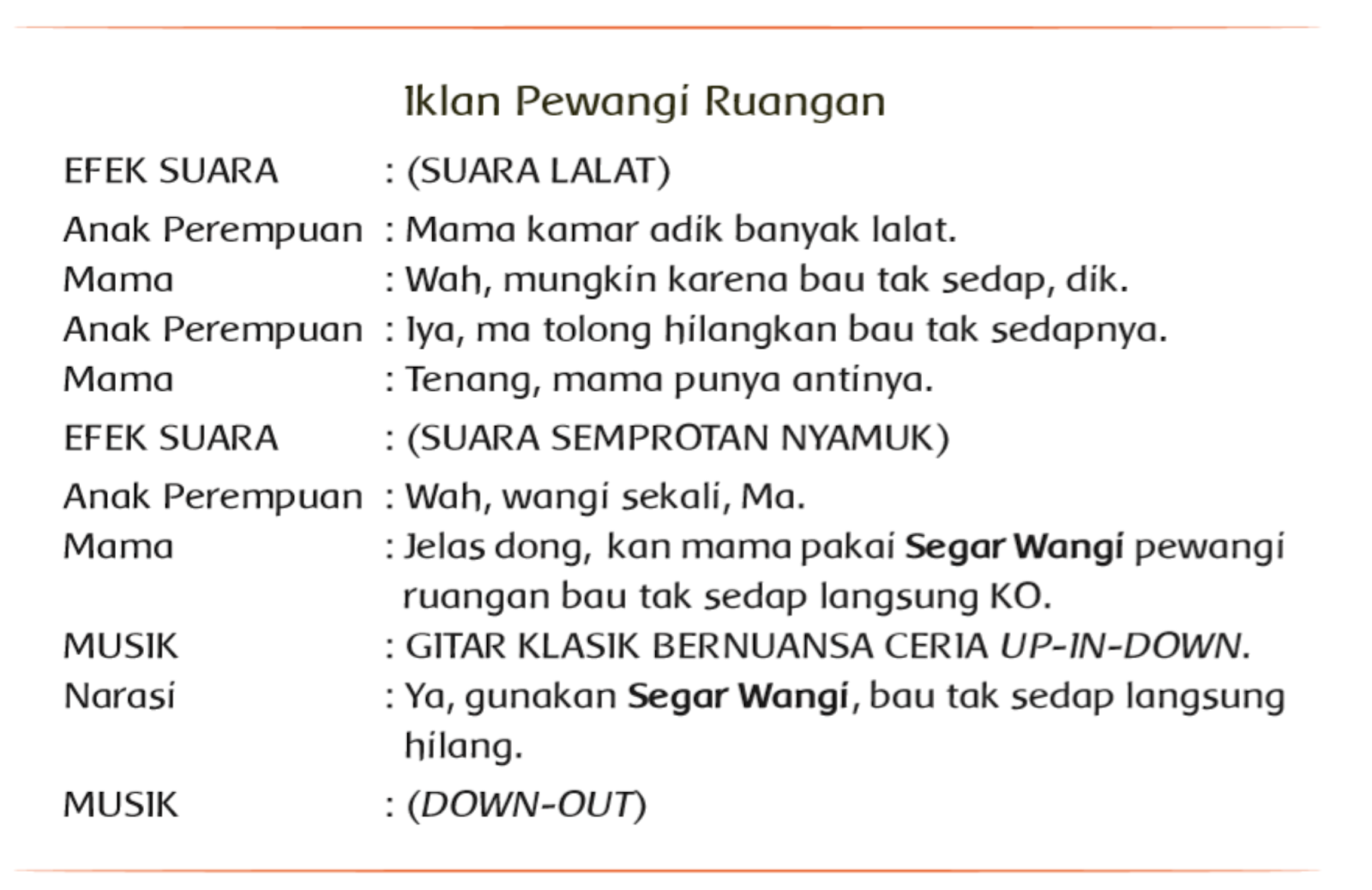 Karena iklan tv waktunya pendek biasanya 30 detik maka kata katanya harus ringkas mudah diucapkan dan diingat. Lalu menentukkan musik atau menggunakan sound fx dengan tujuan untuk menciptakan suasana yang mendukung skenario. Lagipula ini naskah keren banget siapa tahu bisa jadi bahan referensi. Contoh iklan dalam bahasa inggris iklan layanan masyarakat iklan baris iklan lowongan kerja iklan produk iklan niaga iklan penawaran iklan makanan iklan kolom iklan bahasa jawa iklan komersial iklan keluarga iklan shampo iklan produk makanan. Naskah iklan radio sesuai konsep dari produk yang akan diiklankan. Merancang naskah merupakan spesifikasi lengkap dari teks dan narasi dalam iklan televisi.