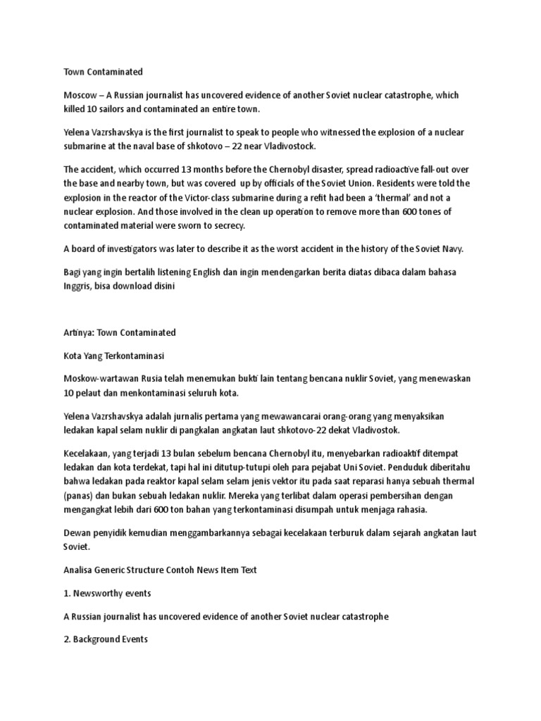 Contoh news item beserta strukturnya. News item adalah teks potongan berita berbahasa inggris. Dengan syarat jika berita tersebut layak atau pantas untuk di konsumsi oleh masyarakat umum. Contoh news item text yang ketiga kali ini tentang town contaminated beserta generic structure struktur dan artinya atau terjemahannya town contaminated moscow a russian journalist has uncovered evidence of another soviet nuclear catastrophe which killed 10 sailors and contaminated an entire town. Banyak sekali berita mengenai kecelakaan di televisi. Contoh news item text tentang polisi mengajak menari.