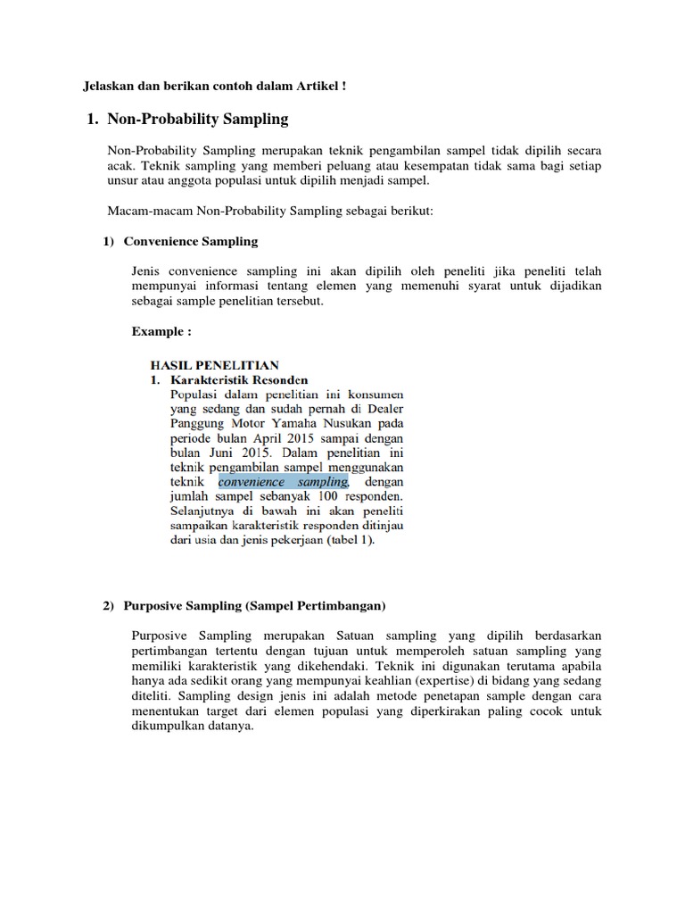 Probability sampling dan non probability sampling dalam buku metode penelitian akuntansi yang ditulis oleh sujoko efferin disebutkan bahwa ada dua teknik pengambilan sampleteknik itu adalah probability sampling dan non probability sampling. Probabilitas elemen populasi yang dipilih tidak diketahui teknik ini tidak memberikan peluang keselamatan sama bagi setiap unsur anggota populasi untuk dipilih menjadi sampel. Purpossive sampling penarikan contoh bertujuan tidak semua populasi bisa dideteksi dengan jelas dimana mereka berada. Jenis jenis non probability sampling purposive sampling accidental sampling. Macam macam non probability sampling sebagai berikut. What is non probability sampling.
