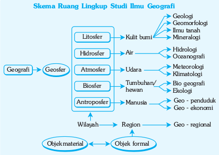 Pada dasarnya objek material geografi merupakan kajian seluruh fenomena yang terjadi di permukaan bumi baik itu ilmu sosial maupun ilmu fisik. Objek material yang umum dan luas adalah geosfer lapisan bumi yang meliputi. Atmosfer lapisan udara terutama ialah lapisan atmosfer bahwa yang dikenal sebagai troposfer. Objek meterial yang umum dan luas adalah geosfer yang meliputi. Lapisan ini disebut kerak bumi dalam ilmu geologi. Objek kajian objek material geografi adalah fenomena geosfer meliputi atmosfer lithosfer biosfer hydrosfer dan anthroposfer.