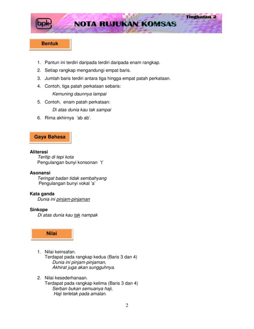 Jumlah kata dalam setiap baris sebanyak 8 hingga 12 suku kata. Pada pantun ini menggunakan sajak a a dimana terdapat hanya 2 baris sedangkan pantun lainnya bersajak a b a b dimana terdiri dari 4 baris.