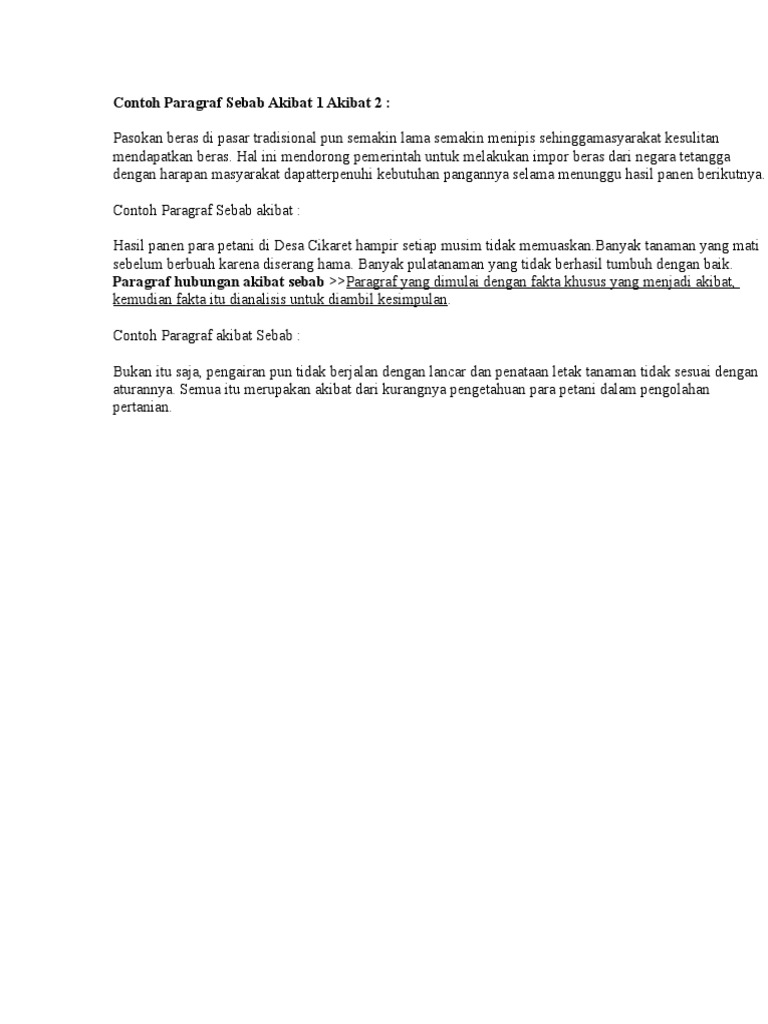 4 contoh paragraf sebab akibat pengertiannya paragraf sebab akibat adalah paragraf berpola induktif yang berisikan sebab sebab dan akibat yang terjadi pada suatu hal yang termuat dalam kalimat kalimat penjelas sebab di awal paragraf dan kalimat utama akibat di akhir paragraf. Paragraf sebab akibat ini merupakan salah satu contoh pola berfikir induktif.