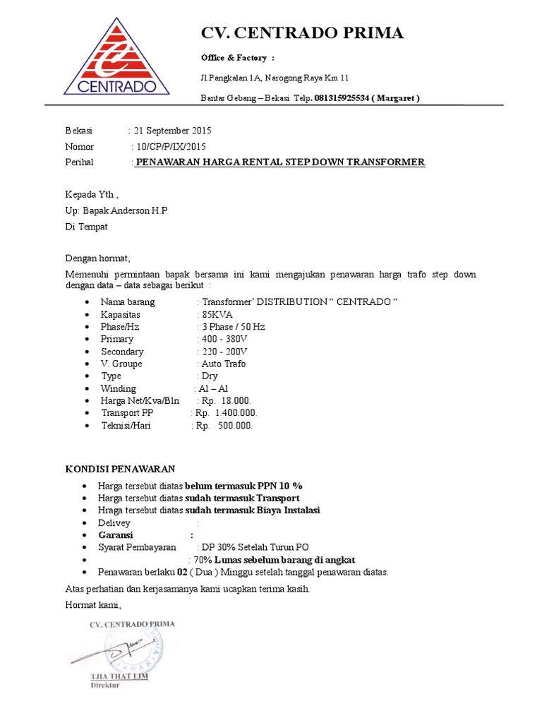 Disamping memiliki pengaruh yang baik untuk membuat jenis usaha kita dapat laris dan laku dipasaran. Membuat penawaran yang baik dan benar serta menarik perhatian adalah impian dari semua orang. Mungkin sedikit berbeda dengan surat lainnya dalam surat penawaran kerjasama terdapat up alamat perusahaan tujuan pengiriman surat jenis barangjasa harga dan lampiran. Sebagai informasi surat penawaran harga ini kami ambil dari dokumen lelang pekerjaan konstruksi dengan sumber dana apbn tahun 2020. Jenis surat ini tergolong masih merupakan salah satu jenis surat yang masih relevan untuk digunakan pada saat sekarang ini. Umumnya surat penawaran digunakan oleh perusahaan perusahaan penyaluran dalam hal ini distributor.