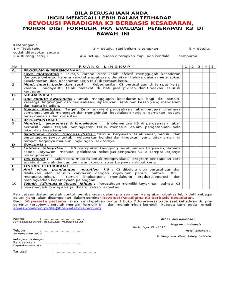 Contoh penerapan sistem manajemen k3 di dunia industri contoh penerapan smk3 di dunia industri di perusahaan perusahaan csi perusahaan perusahaan csi telah berkomitment penuh untuk meningkatkan kinerja keselamatan kerja dalam perusahaan mereka dan telah mencapai peningkatan yang berarti. Kebijakan k3 keselamatan dan kesehatan kerja merupakan syarat dasar dalam membangun sistem manajemen keselamatan dan kesehatan kerja k3 di tempat kerjakebijakan k3 merupakan komitmen pimpinan suatu organisasi perusahaan untuk menjamin keselamatan dan kesehatan kerja seluruh personil di bawah kendalinya juga pihak pihak yang berkaitan berhubungan dengan kegiatan aktivitas operasi.