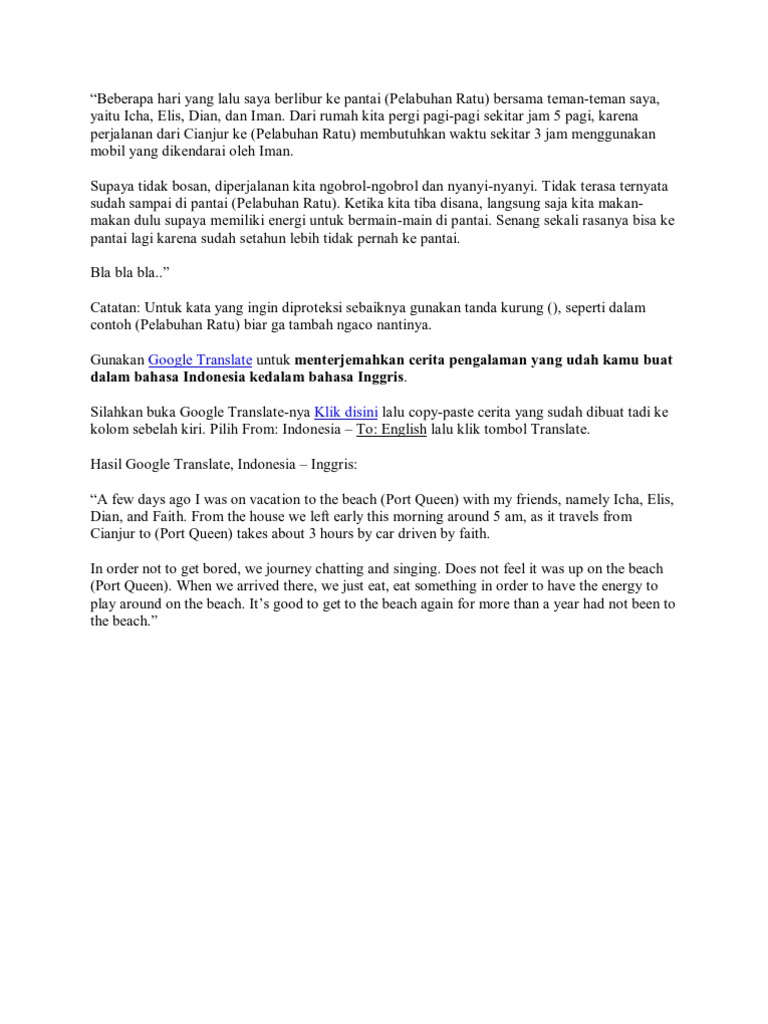 Contoh pengalaman liburan dalam bahasa inggris. For those of you who already have you was the most fortunate in the world. 10 contoh cerita bahasa inggris tentang liburan artinya. Contoh cerita bahasa inggris tentang pengalaman ketika saya masih duduk di sekolah menegah atas saya pernah berlibur ke air terjun yang ada di dekat rumah teman saya. Bingung mau membuat cerita bahasa inggris tentang liburan. Berikut 5 contoh bentuk karangan dalam bahasa inggris beserta dengan artinya. Untuk sobat yang sedang memerlukan contoh recount text bahasa inggris silahkan baca dan amati beberapa teks yang sudah kami siapkan di bawah ini.