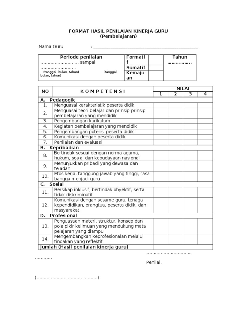 Catatan ini harus dilengkapi dengan bukti bukti fisik tertentu misalnya dokumen pembelajaran dan penilaian alat peraga dan media pembelajaran atau dokumen lain yang menguatkan bukti kinerja guru. Contoh instrumen penilaian kinerja guru rabu 08 februari 2012 pk guru edit setelah adanya sertifikasi guru dengan berdampak pada pemberian tunjangan sertifikasi kepada guru yang tersertifikasi atau dianggap profesional maka diperlukan penilaian secara berkelanjutan terhadap guru profesional tersebut agar kinerjanya tidak berkurang. Penilaian kinerja guru juga dapat diartikan sebagai penilaian dari setiap butir kegiatan tugas utama guru dalam rangka pembinaan karir kepangkatan dan jabatannya. Buku penilaian kinerja tenaga pendidik kependidikan paud tk kb tpa sps atau lebih dikenal dengan penilaian kinerja guru. Permenneg pan dan rb nomor 16 tahun 2009 mendefinisikan penilaian kinerja guru adalah penilaian dari setiap butir kegiatan tugas utama guru dalam rangka pembinaan karir kepangkatan dan jabatannya. Buku 2 penilain kinerja guru unduh disini.