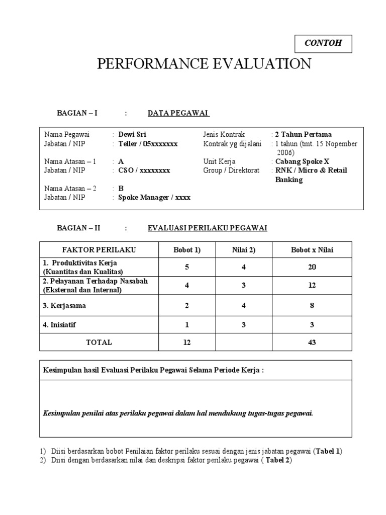 Mengetahui penilaian kinerja karyawan yang efektif sangat penting untuk meningkatkan produktivitas karyawan maupun perusahaan sehingga penilaian kinerja tidak lagi menjadi kegiatan yang menegangkan atau sia sia. Penilaian kinerja menurut mondy dan noe 1993394 merupakan suatu sistem formal yang secara berkala digunakan untuk mengevaluasi kinerja individu dalam menjalankan tugas tugasnya. Penilaian kinerja karyawan memang seharusnya diterapkan untuk mengetahui kualitas kinerja karyawan dan untuk memotivasi karyawan agar lebih produktif. Contoh laporan evaluasi kinerja karyawan contoh laporan evaluasi kinerja perusahaan contoh laporan evaluasi penyuluhan pertanian contoh laporan evaluasi kegiatan contoh laporan evaluasi hasil kerja contoh laporan evaluasi kinerja karyawan contoh laporan evaluasi dan monitoring contoh laporan evaluasi pelatihan spmi contoh laporan evaluasi dosen contoh laporan evaluasi program contoh. Untuk itu sistem penilaian kinerja harus. Rumus contoh dan indikator kinerja bank sudah saya sajikan di atas.