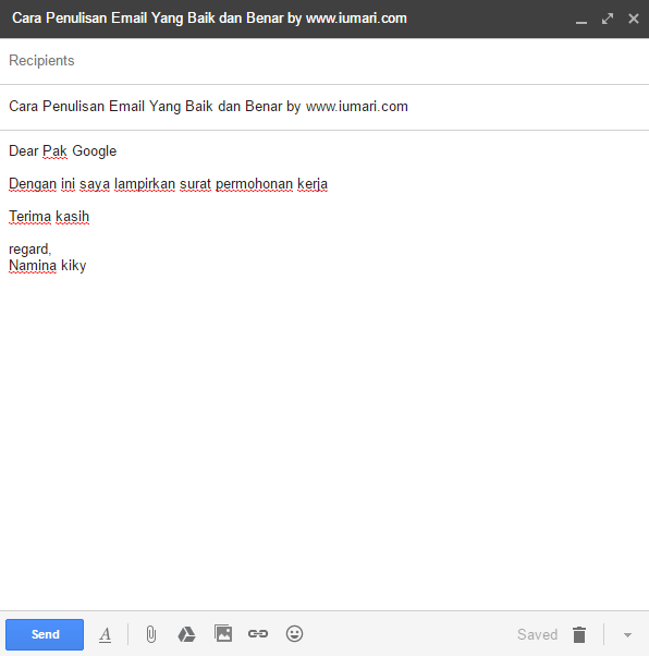 Contoh penulisan email yang benar. Sebelum masuk ke pembahasan mengenai hal ini pastikan terlebih dahulu bahwa kamu sudah memiliki email gmailkarena tutorial kali ini menggunakan interface email gmail jadi untuk pengguna email lain seperti email yahoo ataupun outlook tampilannya sedikit berbeda. Demikian atas perhatian bapak saya mengucapkan terima kasih. Penulisan daftar pustaka yang benar cara membuat contoh dalam penulisan sebuah karya ilmiah kita diharuskan untuk menyajikan suatu informasi dengan disertai sumber yang benar. Saya benar benar menunggu review anda terhadap pengerjaan aplikasi yang sudah saya kerjakan. Bahkan konon di negara kuba menjadi pengangguran merupakan suatu tindakan kriminal yang bisa dipidanakan. Tips dalam menulis email formal yang baik dan benar.