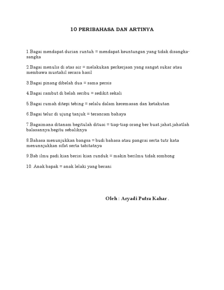 Berikut adalah contoh peribahasa perumpamaan beserta artinya. Bagai air di atas daun talas. Dalam bahasa indonesia terdapat banyak sekali peribahasa perumpamaan di artikel ini kita akan memberikan beberapa contoh untuk dipelajari. Kumpulan peribahasa dalam bahasa inggris proverb dan maknanya memberikan gambaran jika dalam bahasa inggris itu sangat luas yang dimana tentu saja kita akan menemukan banyak pribahasa yang memiliki arti dan makna yang mendalam yang bisa kalian jadikan sebuah kalimat yang bak. Para guru dan murid boleh muat turun jadual di atas dan cetaknya sebagai rujukan. Peribahasa beserta artinya 1.