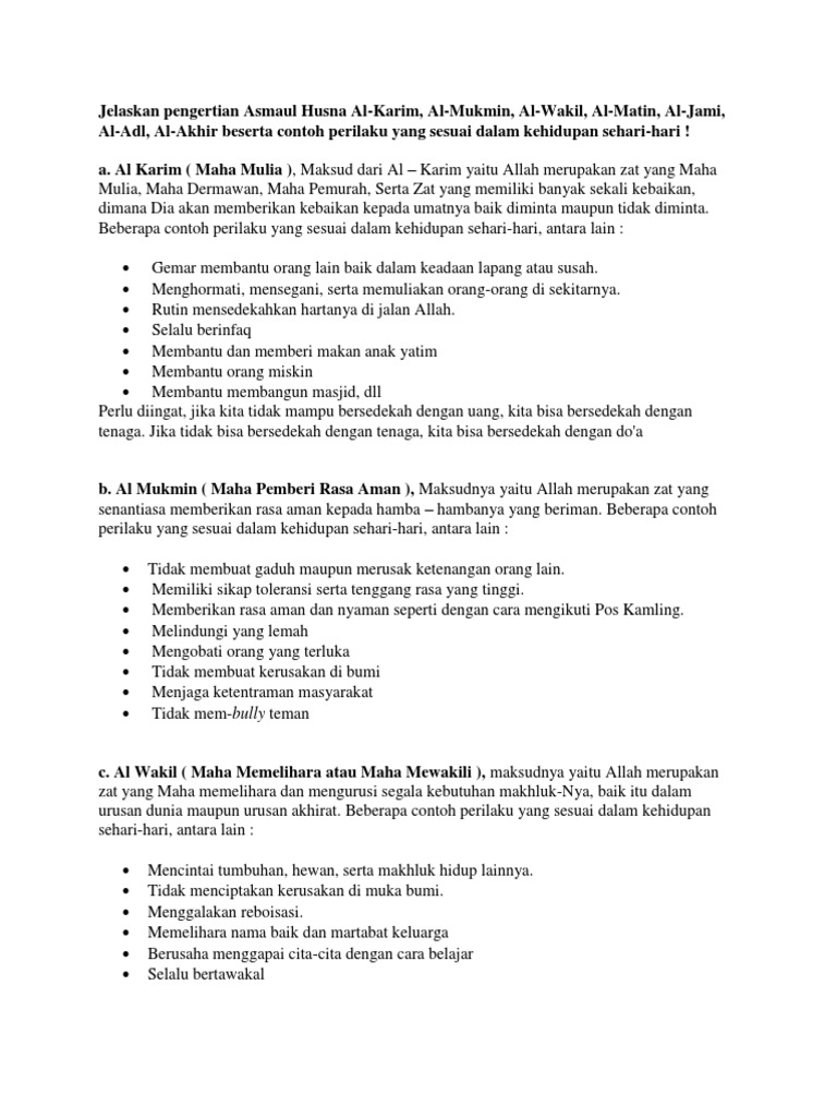 Bekerjabelajar dengan sungguh sungguh karena allah tidak akan merubah nasib seseorang yang tidak mau berusaha. Makna asmaul husna al wakil. Al wakil yang maha mewakili ataupun pemelihara ialah allah swt. Baca juga al karim. Contoh perilaku yang dapat diteladani dari sifat al wakiil adalah kita harus berusaha keras dalam mengerjakan sesuatu. Selain itu contoh perilaku sehari hari yang berkaitan dengan al jami adalah m engajak orang untuk sholat berjamah dan m enjaga pergaulan dengan baik.