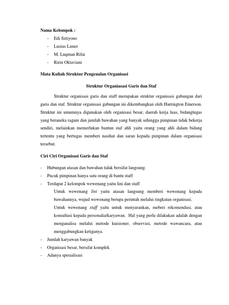 Contoh perusahaan yang menggunakan struktur organisasi lini dan staf. Dalam sebuah pt selain kekayaan pemilik modal dan kekayaan perusahaan yang terpisah juga ada pemisahan antara pengelola perusahaan dan pemilik perusahaan. Dalam hal ini struktur organisasi sendiri merupakan berbagai macam pembagian tugas dan juga bagaimana tanggung jawab yang dimiliki oleh komponen komponen penting yang ada dalam suatu perusahaan. Pengorganisasian ini berkaitan dengan pengelompokan kegiatan pengaturan orang maupun sumber daya lainnya dan mendelegasikannya kepada individu ataupun unit tertentu untuk menjalankannya sehingga diperlukan penyusunan. Salah satu contoh perusahaan organisasi lini yaitu mc donalds indonesia corporations adalah salah satu perusahaan yang bergerak dalam bidang makanan fastfood yang terkenal. Admin blog berbagai struktur penting 2019 juga mengumpulkan gambar gambar lainnya terkait perusahaan yang menggunakan struktur organisasi lini dan staf dibawah ini. Contoh organisasi lini dan staff salah satu contoh perusahaan yang menggunakan organisasi lini dan staff adalah pt.