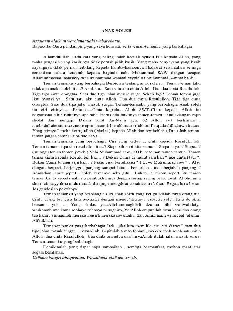 Contoh naskah pidato tentang ciri ciri anak shaleh shalehah anak shaleh ataupun shalehah merupakan harapan dan idaman semua orang tua. Ada beberapa ciri ciri dari anak shaleh shalehah. Pidato tentang anak yang sholeh السلام عليكم ورحمةالله وبركاته الحمدلله والصلاةوالسلام على رسول ا لله و على اله و صحبه ومن ولاه. Anak sholeh tema pildacil anak soleh assalamu alaikum warohmatulahi wabarokatuh. Alhamdulillahirabbilalamin washolatu wassalamu ala ashrofil ambiyai walmursalin sayyidinaa wa maulana muhammadin. File berformat microsoft word documents docrtf silahkan download secara gratis dan kembangkan kembali agar lebih sempurna.