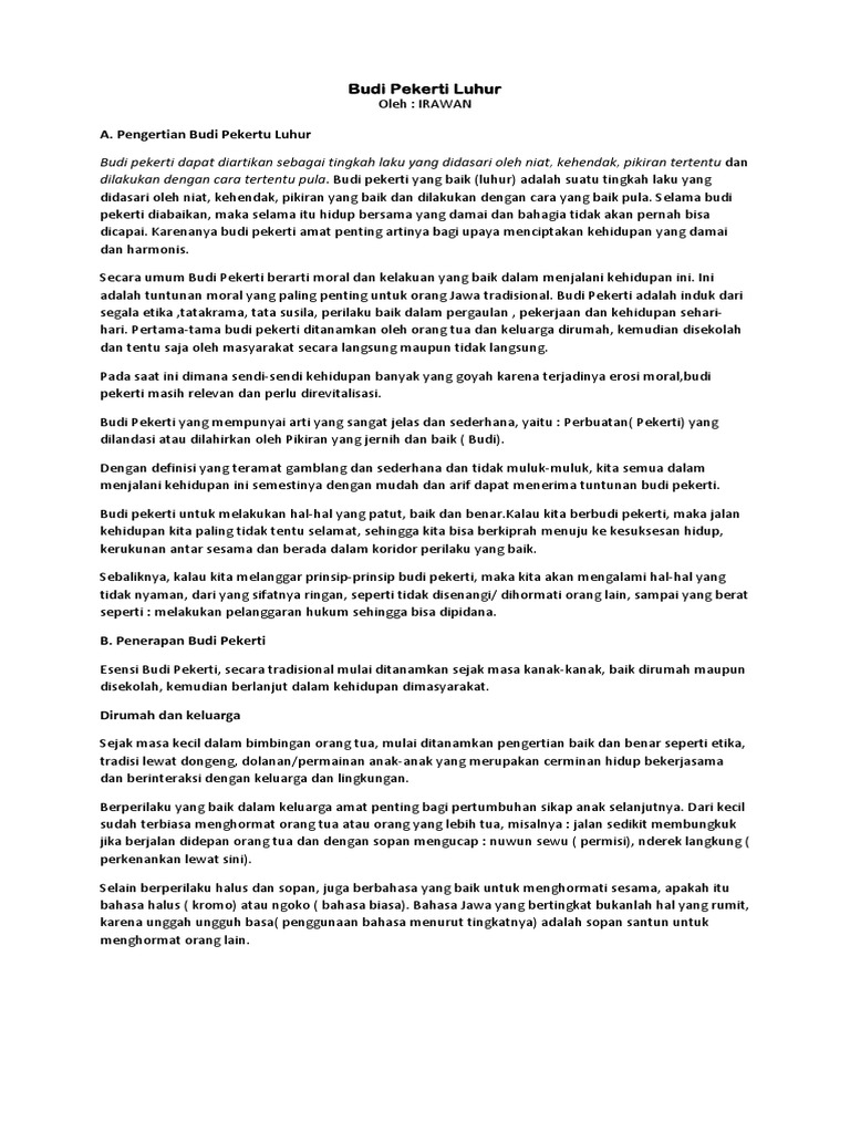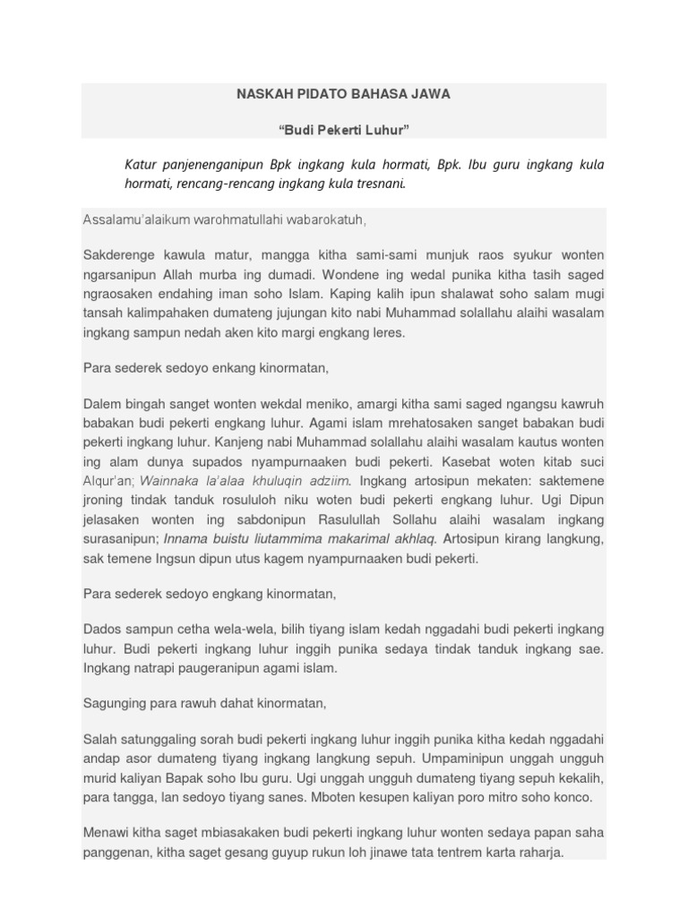 Budi pekerti atau biasa kita kenal dengan akhlaq yang baik adalah salah satu hal yang harus kita junjung tinggi disamping pendidikan yang sedang kita kejar. Budi pekerti merupakan salah satu tatanan hidup yang sangat baik jika kita terapkan dalam kehidupan sehari hari. Contoh pidato bahasa jawa tentang acara halal bil halal assalamualaikum wr. Di bawah ini ada kumpulan contoh geguritan bahasa jawa dengan berbagai macam tema yang bisa anda tembangkan atau bisa anda jadikan referensi dalam latihan menulis geguritan bahasa jawa. Jika kamu diminta untuk menyampaikan pidato bahasa jawa tentang budi pekerti maka kamu perlu mengetahui sasaran pendengar isi pidato yang kamu sampaikan. Naskah pidato tentang budi pekerti budi pekerti merupakan suatu hal yang sangat krusial untuk kelangsungan hidup manusa menjadi lebih baik.