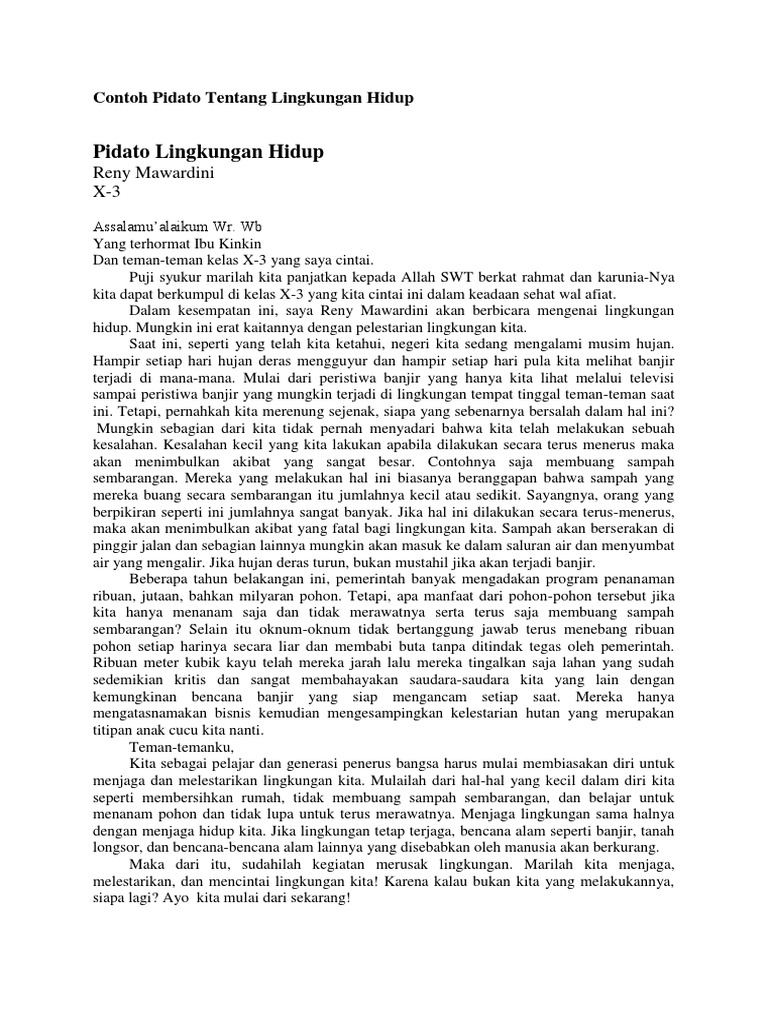 Iklan tengah artikel 1. Demikianlah contoh pidato lingkungan hidup kali ini semoga contoh ini bisa menjadi referensi pembaca dalam membuat naskahteks pidato sendiri yang baik dan benar. 903 am herlambang priyo trapsilo no comments pidato lingkungan hidup. Anda bisa menyimak contoh pidato singkat tentang lingkungan hidup berikut ini untuk mempelajari cara membuat teksnaskah pidato sendiri atau juga sebagai bahan latihan membawakan pidato di depan kelas. Puji syukur marilah kita panjatkan kepada allah swt berkat rahmat dan karunia nya kita dapat berkumpul di kelas x 3 yang kita cintai ini dalam keadaan sehat wal afiat. Teks pidato tentang lingkungan hidup.