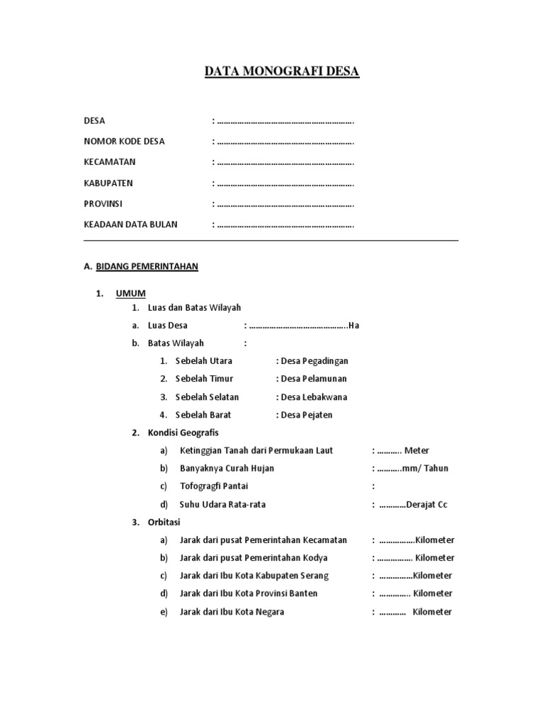 Profil desa dapat digunakan bahkan menjadi salah satu sumber pengisian format yang ada pada rkp desa. Profil desa bakbakan lengkap perdes nomor 1 tahun 2015 tentang bumdes. Contoh biografi diri sendiri biografi merupakan tulisan tentang perjalanan hidup atau riwayat hidup seseorang yang dapat ditulis dalam beberapa baris kalimat saja atau sampai menjadi sebuah buku. Simpan simpan contoh profil desa untuk nanti. Contoh format data potensi desakelurahan 41 halaman. Contoh profil desa kelurahan desa tinatar kecamatan punung kabupaten pacitan ditulis imago media 10 october 2015 saturday august 27 2016 5 komentar daftar isi artikel.