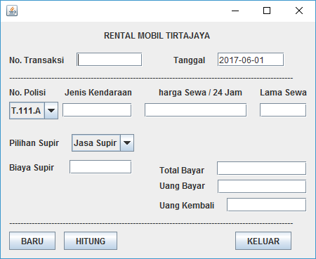 Contoh dasar program java sederhana bagi teman teman yang sedang belajar java dibawah ini ada contoh program program dasar pemograman java dan contoh dari latihan dasar belajar pemograman berorientasi objek mulai dari deklarasi proses sampai output. Memiliki sebuah laptop atau komputer yang telah terinstal aplikasi jdk netbean yang nantinya akan digunakan untuk menulis dan menjalankan program. Program sederhana transaksi menggunakan java desktop dengan netbeans gui latihan sekarang kita buat program transaksi sederhana menggunakan java dengan netbeans hasilnya seperti gambar dibawah ini.