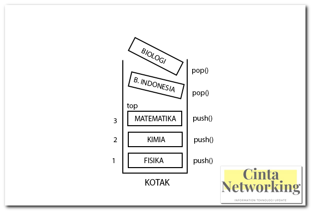 Pop digunakan untuk mengeluarkan data teratas dari stack. Stack adalah sebuah kumpulan data dimana data yang diletakkan di atas data yang lain. Pengertian stack pada struktur data adalah sebagai tumpukan dari benda sekumpulan data yang seolah olah diletakkan di atas data yang lain koleksi dari objek objek homogen atau suatu urutan elemen yang elemennya dapat diambil dan ditambah hanya pada posisi akhir top saja. Stack bisa diartikan sebagai suatu kumpulan data yang seolah olah ada data yang diletakkan di atas data yang lain. Biasanya kita akan menjumpai topik ini pada awal materi setelah array karena array dibutuhkan dalam. Dengan demikian elemen terakhir yang disimpan dalam stack menjadi elemen pertama yang diambil.