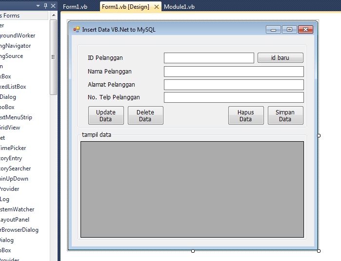 Setelah melakukan langkah langkah diatas buatlah fungsi fungsi pendukung untuk mengelola database seperti berikut. Ok kalian bisa mendownload download file nah untuk menjalankan program ini kita harus memili software 1. Modul iv membuat aplikasi tambah edit dan hapus dengan visual basic 2010 buat file module koneksi ke database dengan mengkilk kanan proyek dan memilih add module lalu berikan nama modkoneksi dan ketik script sebagai berikut. Msql conector 4xampp lankahnya. Selamat siang teman teman kali ini saya akan share contoh program dengan menggunakan database. Kita mulai dengan membuka program vb dengan cara.