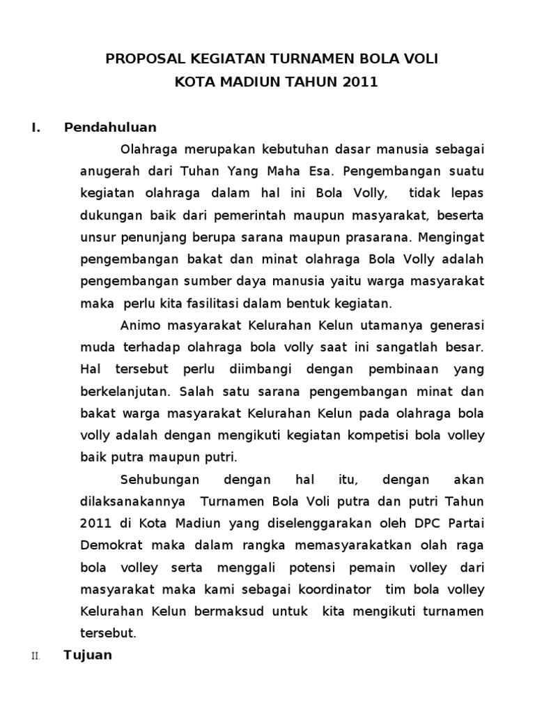 Contoh proposal pengajuan bantuan dana pembuatan lapangan bola voli teknik dalam bermain bola voli sebelum anda ikut bermain voli ada baiknya anda harus tahu lebih dulu dari aturan dalam bermain bola voli. Semangat berolahraga agar dapat mengembangkan jiwa sportivitas dan mewujudkan rasa tanggung jawab demi kemajuan dunia olahraga bola vol i di ntt. Hal ini terbukti dengan makin banyaknya kejuaraan bola volly yang diadakan baik di tingkat daerah maupun di tingkat nasional. Pembenahan sarana olahraga volley. Bola volly sebagai salah satu olahraga yang popular baik ditingkat internasional maupun nasional dalam perkembangannya saat ini banyak digemari oleh masyarakat indonesia baik masyarakat umum maupun kalangan mahasiswa. Bola voli dengan cepat menyebar hingga ke pelosok pelosok desa di indonesia jadi tidak heran kalau banyak klup bola voli di berbagai tempat tidak hanya di kota kota besar di desa desa yang terpencilpun ada juga klup bola voli.