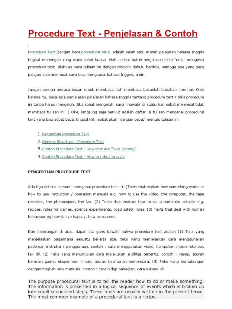 Contoh prosedur teks dalam bahasa inggris. Struktur teks ini didominasi dengan kalimat perintah karena teks prosedur adalah sebuah instruksi. 22 contoh teks prosedur sederhana kompleks dan protokol untuk pembahasan kali ini kami akan memberikan ulasan mengenai contoh teks prosedur yang dimana dalam hal ini meliputi contoh teks prosedur sederhana kompleks dan protokol nah agar lebih dapat memahami dan mengerti simak ulasan selengkapnya dibawah ini. Anda pasti sudah tidak asing lagi dengan procedure text bukan procedural text. Anda procedure text. 13 jenis teks dalam bahasa inggris beserta contoh dan struktur materi tentang jenis teks bahasa inggris yang biasa digunakan dalam sebuah karya tulis dengan grammar dan contoh lengkap. Setelah itu akan dijelaskan satu persatu langkah dalam membuat sesuatu.