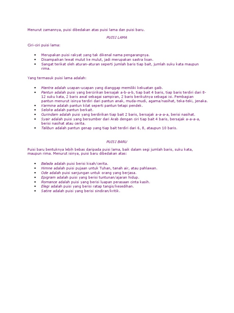 Pembagian puisi baru didasarkan pada dua hal yaitu berdasarkan isi dan bentuknya. Di bawah ini terdapat beberapa contoh puisi balada. Berikut ini contoh balada. Pengertian puisi balada ciri ciri dan contoh balada lengkap balada adalah salah satu jenis puisi baru yang berisi tentang sebuah kisah atau cerita tertentu. Larik terakhir yang berada pada bait pertama dipakai sebagai refren dalam bai bait selanjutnya. Balada terdiri atas 3 bait dengan tiap bait terdiri atas 8 baris dan berima a b a b c c b kemudian beralih jadi berima a b a b b c c b c.