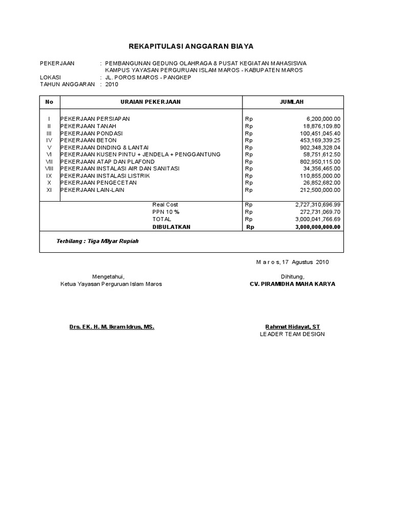 Di dalam menghitung biaya rekapitulasi ini anda juga bisa memasukkan biaya tambahan dan pajak. Menjadi sheet rekapitulasi rab. Contoh rencana anggaran biaya rabxlsx. Luas bangunan 6m x 10 m 60m2 jadi rencana anggaran biaya bangun rumah sebesar 60m2 x rp250000000 rp15000000000 terbilang. Seratus lima puluh juta rupiah contoh penjelasan detail hitung rab sistem meter persegi bangunan bisa dibaca di cara mudah menghitung rab rumah. Excel terlebih dahulu dari laptop komputer atau gadget yang digunakan.