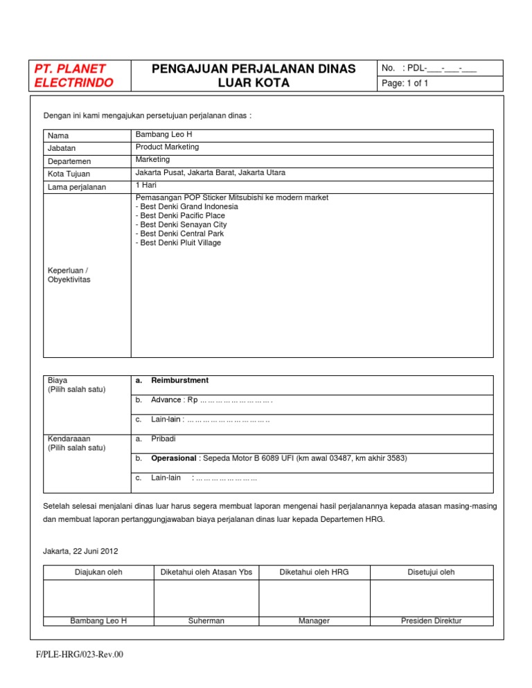 No rincian biaya jumlah keterangan. Telepon 021 23232323 faksimile 021 34343434 e mail. Ditambah dengan biaya tikettransport. Maksud dantujuan tujuan perjalanan dinas ini dalam rangka. 13 mei 2014 no. Tugas kerja tersebut bisa berupa study banding audit ke perusahaan cabang rapat kerja nasional maupun pekerjaan pekerjaan lain yang dilakukan di luar kota tidak di lingkungan kantor sendiri.