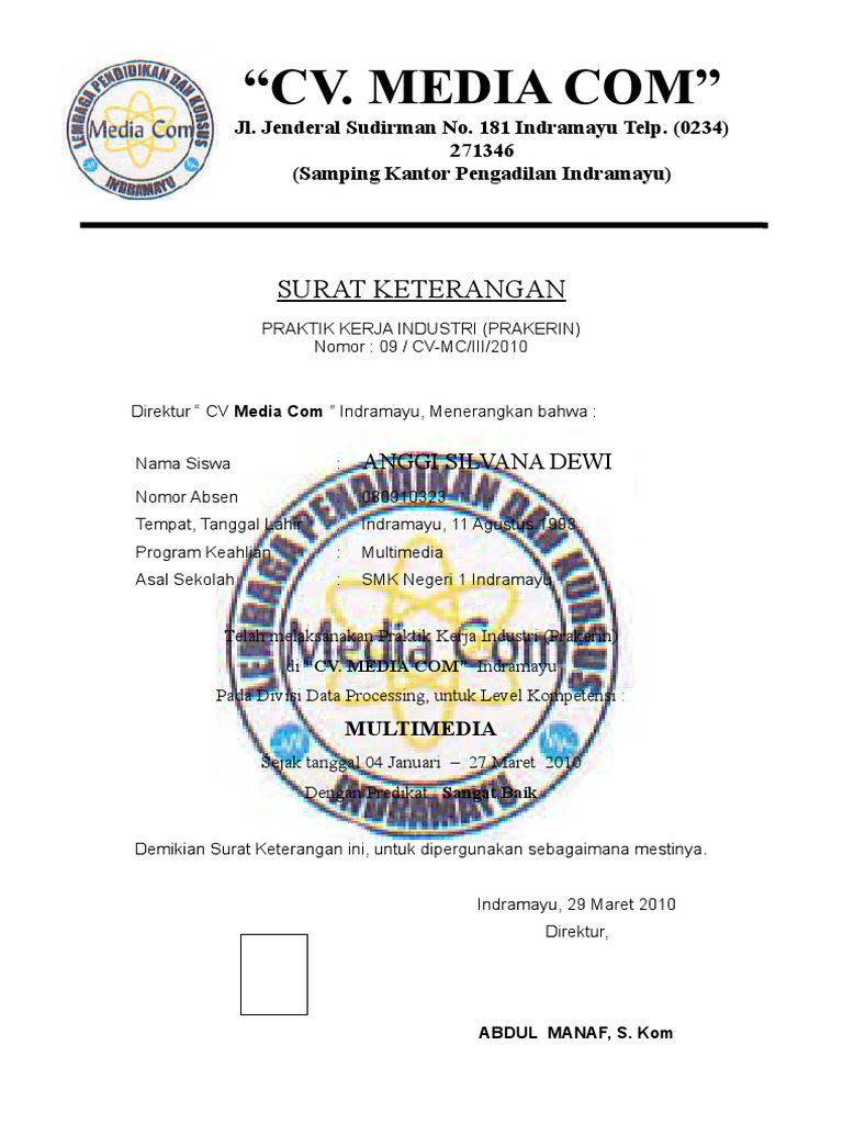 Contoh sertifikat prakerin 1. O magang prakerindpkl bidangjurusan multimedia. Sertifikat ini dapat diberikan oleh pihak perusahaan atau dari pihak sekolah dengan beberapa kriteria penilaian yang telah ditentukan masing masing.