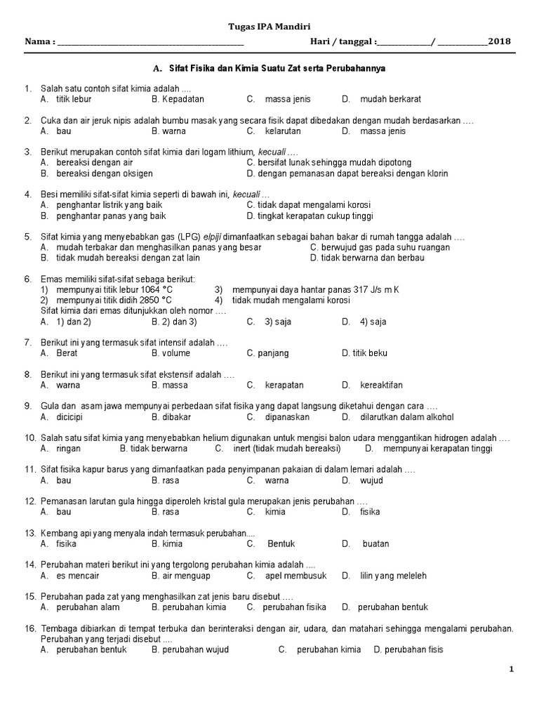 Ada banyak contoh perubahan fisika dalam kehidupan sehari hari yang bisa diamati di sekitar misalnya saat es mencair atau pada larutan air gula. Sifat fisika adalah sifat suatu zat yang dapat diamati diukur atau dirasakan oleh panca indra seperti warna ukuran wujud zat bau rasa titik didih titik leleh kelarutan kelenturan kekerasan dan daya hantar listrik. Selanjutnya adalah diskusi tentang sifat kimia. Sifat ini dapat diamati tanpa mengubah zat zat penyusun materi tersebut. Sifat senyawa yang paling mendasar dan umum untuk digunakan adalah sifat fisika dan sifat kimia. Demikianlah artikel contoh soal perubahan matrei fisika dan kimia beserta pembahasan semoga dapat bermanfaat bagi sobat semua jika sobat masih ingin belajar dengan soal silakan sobat klik contoh soal ipa di menu atas jika sobat ingin menlihat daftar materi yang sudah ada silakan sobat klik materi ipa di menu atas sekian saja dari saya apabila ada kesalahan kata atau kalimat saya mohon maaf.