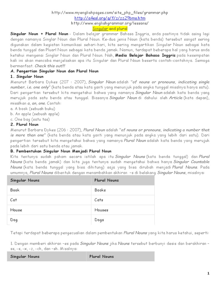 Semoga materi ini dapat menambah pengetahuan kita semua. Beberapa noun mempunyai bentuk plural tapi mengambil bentuk verb yang singular. Itu semua mengenai penjelasan lengkap singular dan plural nouns meliputi pengertian bentuk dan contoh penggunaan singular dan plural nouns dalam kalimat. Umumnya plural nouns dibentuk dengan menambah huruf s di belakang kata benda yang akan dibuat dalam bentuk jamak misalnya. Perhatikan catatan dan contoh pembentukan plural nouns berikut di bawah ini. Pengertian contoh singular dan plural dalam bahasa inggris tahukah kalian tentang singular dan plural.