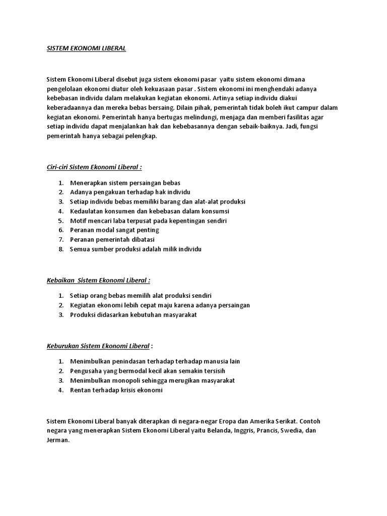 Pengertian sistem ekonomi liberal. Namun negara tetap menyediakan fasilitas umum meskipun ekonomi liberal menikmati pasar bebas.