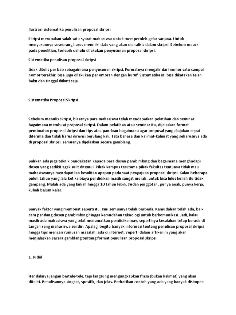 Pedoman penulisan skripsi ini terkadang ada sedikit perbedaan sehingga perlu melihat lagi pedoman penulisan skripsi di masing masing universitas namun demikian tidak menutup kemungkinan digunakan oleh mahasiswa manapun. 12 lembar pengesahan halaman ini menunjukkan bahwa naskah proposal skripsi telah disetujui oleh pembimbing untuk dilanjutkan ke tahap penelitian. Sistematika penulisan proposal skripsi 11 halaman sampul. Secara garis besar skripsi ini terdiri dari 6 enam bab dengan beberapa sub bab. Institusi penyelenggara dan tahun pengajuan proposal skripsi contoh pada lampiran l 1. Sebagai pedoman dalam setiap sistematika penulisan senantisa menghubungkan pendahuluan tujuan hasil sampai penarikan kesimpulan.