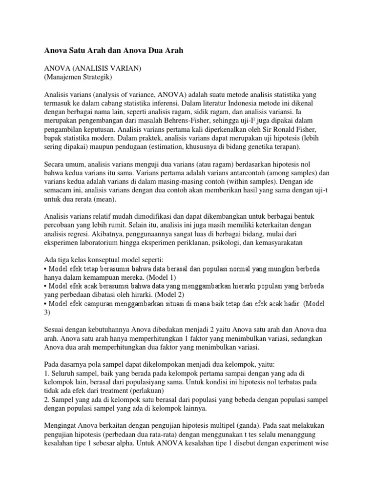 Anova dua arah digunakan peneliti untuk mengatasi perbedaan nilai variabel terikat yang dikategorikan berdasarkan variasi bebas yang banyak dan masing masing variabel terdiri dari beberapa kelompok. Dalam anova dua arah kita ingin mengetahui ada atau tidaknya perbedaan beberapa variabel bebas dengan sebuah variabel terikatnya dan masing masing variabel mempunyai dua jenjang atau lebih. Contoh kasus uji anova satu arah secara manual aksiomatik. Anova dua arah lebih efisien daripada anova satu arah karena. Anova dua arah merupakan penyempurnaan anova satu arah. Selain itu akan dicoba sedikit contoh kasus cara pengerjaan secara manual.